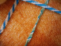 Teraz je na začiatku oranžová bavlnka. Tou urobímke uzlík na červenú bavlnku. |